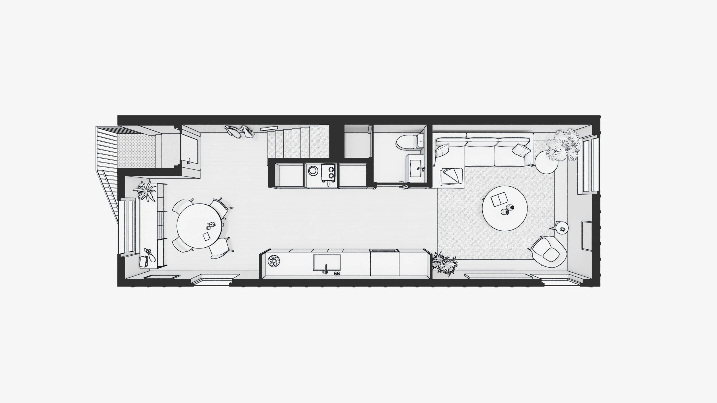 Then you’re home. The difference made by changing this stair placement is subtle, but significant. Your furniture fits naturally in a clear room, efficiency feels effortless, light pours more deeply inside.